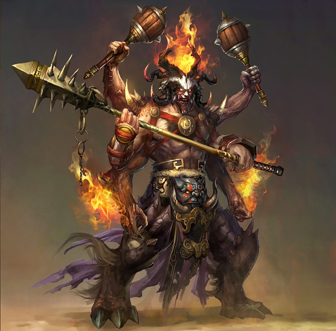 他巨齿獠牙,双目圆瞪,满脸饰纹,狰狞凶悍。