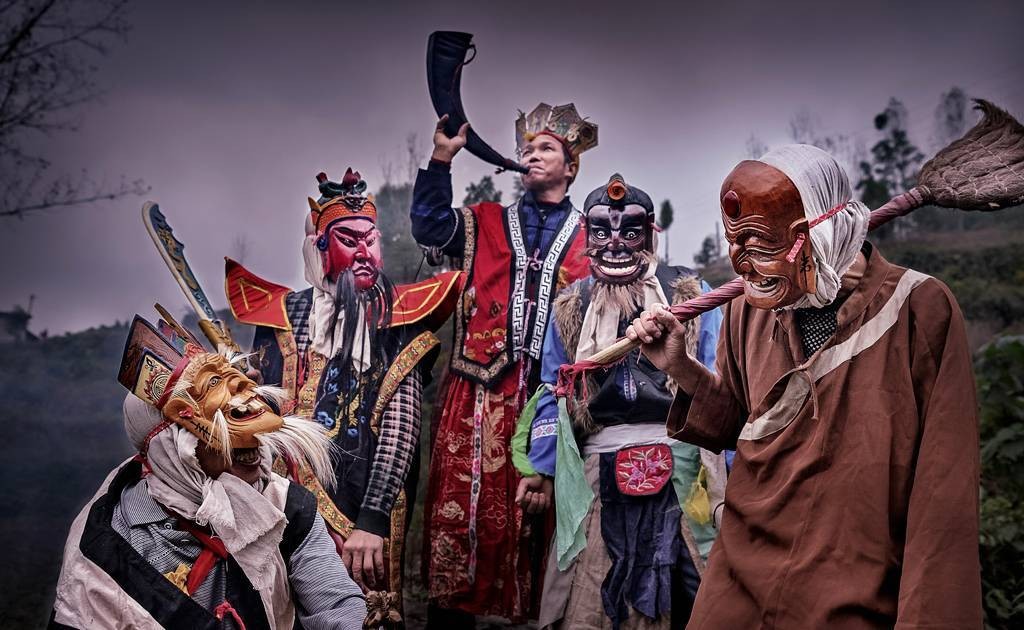 傩仪中,他通常手舞斧钺,上劈下砍,驱鬼逐疫,斩杀邪魔,气势贲张,情绪奔放,效仿盘古开天辟地之势。
