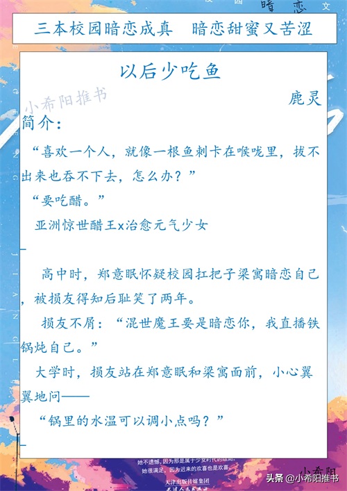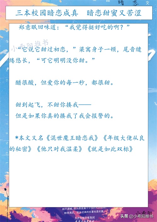 简要概括:这本也是校园救赎暗恋文,男主暗恋女主,暗恋了三年不敢表白,只是偷偷送东西默默关注身影,打消一部分骚扰者。这本很甜,主要大学校园,男主主动靠近追求。
