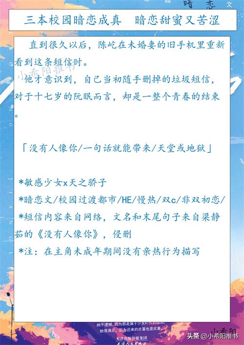 简要概括:这本校园暗恋文,双向暗恋后久别重逢。女主先暗恋男主,男主从不知道,还误会女主和小竹马是一对。男主后来早就对女主心动,只是未发现,后来两人各奔东西,未相见的日子男主一直暗恋着女主。