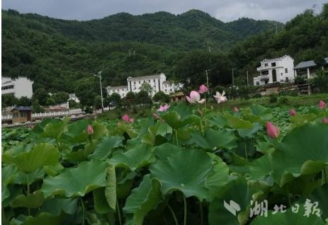 为了让自然美景更好地呈现在游客面前,五年前,集镇所在地的新潮村把外出务工而闲置的百亩低产田流转过来改造成荷花游园,引进集观赏与食用于一体的“鄂莲一号”,修建纳凉亭、栈道、健身步道、小广场、石窟,栽植斑竹、紫薇、石楠、垂柳等景观树木。盛夏时节,每逢晚上下班后,人们不约而同从四面八方涌入荷花游园,三三两两少男少女结伴而行,踏着温婉抒情的《荷塘月色》旋律,感受到“晚风尽吻荷花叶,任我醉倒在池边……(《拥抱》阿信)”的诗情画意。周末、节假日期间,更有慕名而来的十堰城区游客在颇具“小桥,流水,人家”风格的叶大新集镇转悠一圈后,再进入荷花游园,会情不自禁赞美“四面垂杨十里荷,问云何处花最多。画楼南畔夕阳和……(《涴溪沙·荷花》苏轼)”。