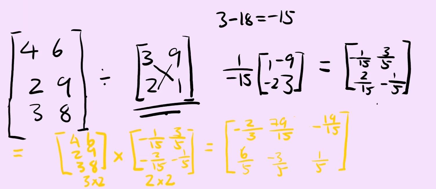知道了怎么找一个矩阵的倒数,就可以做矩阵除法啦!我们只要找到除数的倒数,再用被除数乘以它就可以了。比如: