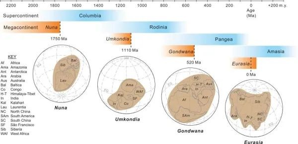 中国科学院地质与地球物理研究所岩石圈演化国家重点实验室博士后王冲与研究员Ross Mitchell、彭澎,以及加拿大圣弗朗西斯泽维尔大学教授Brendan Murphy、加拿大皇后大学博士Christopher Spencer合作,通过对超大陆重建的分析,识别出古元古代以来地球上出现的类似于冈瓦纳的大陆,并将其称为“巨大陆”(Megacontinent)。它们分别是预测未来出现的阿美西亚超大陆对应的欧亚巨大陆、潘吉亚超大陆对应的冈瓦纳巨大陆、罗迪尼亚超大陆对应的乌肯迪亚巨大陆和哥伦比亚超大陆对应的努纳巨大陆(图2)。分析表明,超大陆形成之前的~1.5至2亿年均会存在巨大陆,巨大陆是超大陆的“雏形”,是超大陆的聚合相。巨大陆形成之后,大洋关闭,巨大陆与其他大陆碰撞形成超大陆,暗示二者之间的时空关系,如冈瓦纳在南半球高纬度形成,随后向北迁移,随着大洋的关闭成为潘吉亚超大陆的一部分。