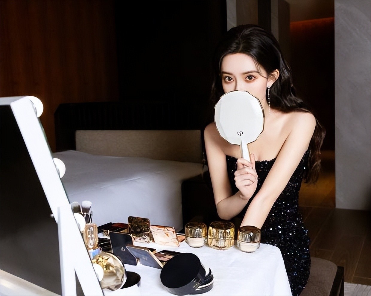 孟子义穿抹胸裙性感迷人 拿化妆镜遮脸娇羞可爱