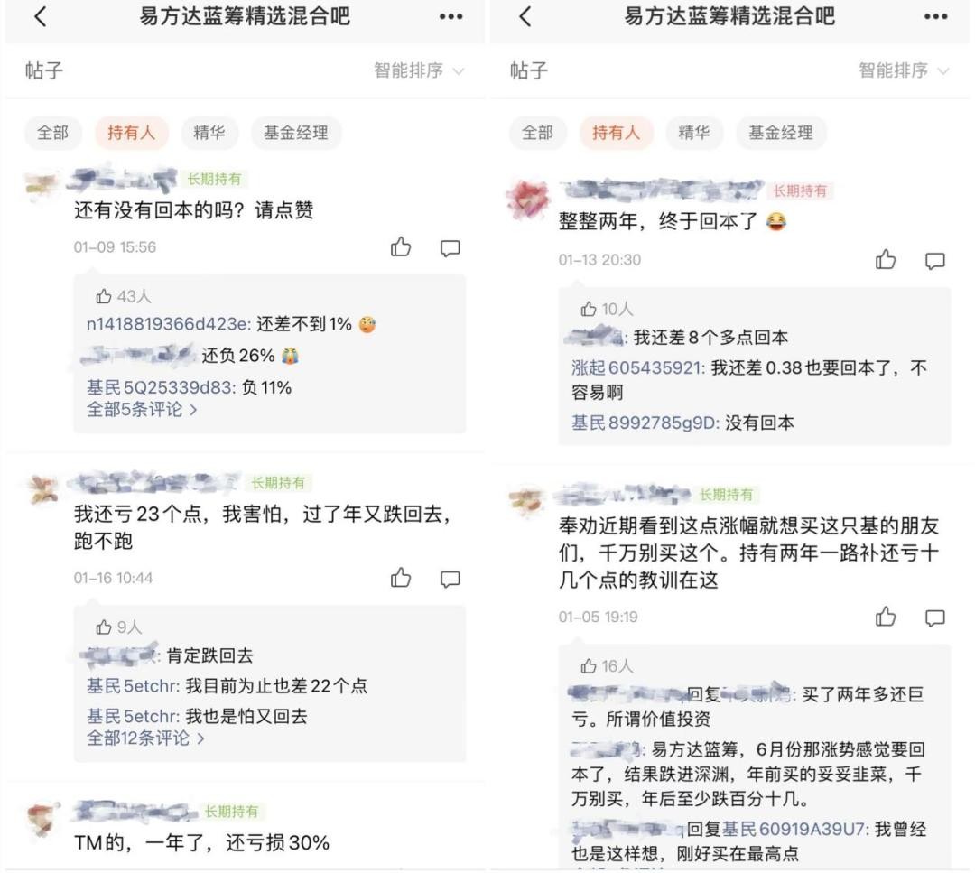 事实上,在易方达蓝筹精选的讨论区,也确实有不少基民表示在此次大涨后依然处于亏损状态,涨过后亏损幅度在20%,甚至30%以上的都有。