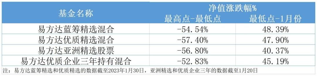 从涨跌幅来看,从2021年2月份的高点到2022年10月份的低谷,张坤在管的四只基金跌幅都在50%以上。从2022年11月1日至2023年1月30日,这四只基金均上涨了40%以上。