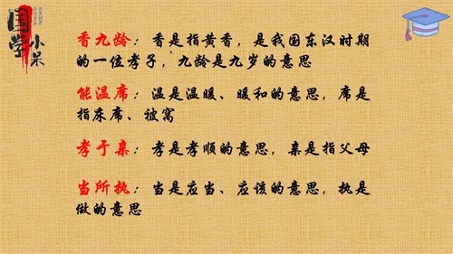 香九龄:香是指黄香,是我国东汉时期的一位孝子,九龄是九岁的意思能温席:温是温暖、暖和的意思,席是指床席、被窝孝于亲:孝是孝顺的意思,亲是指父母所当执:当是应当、应该的意思,执是做的意思