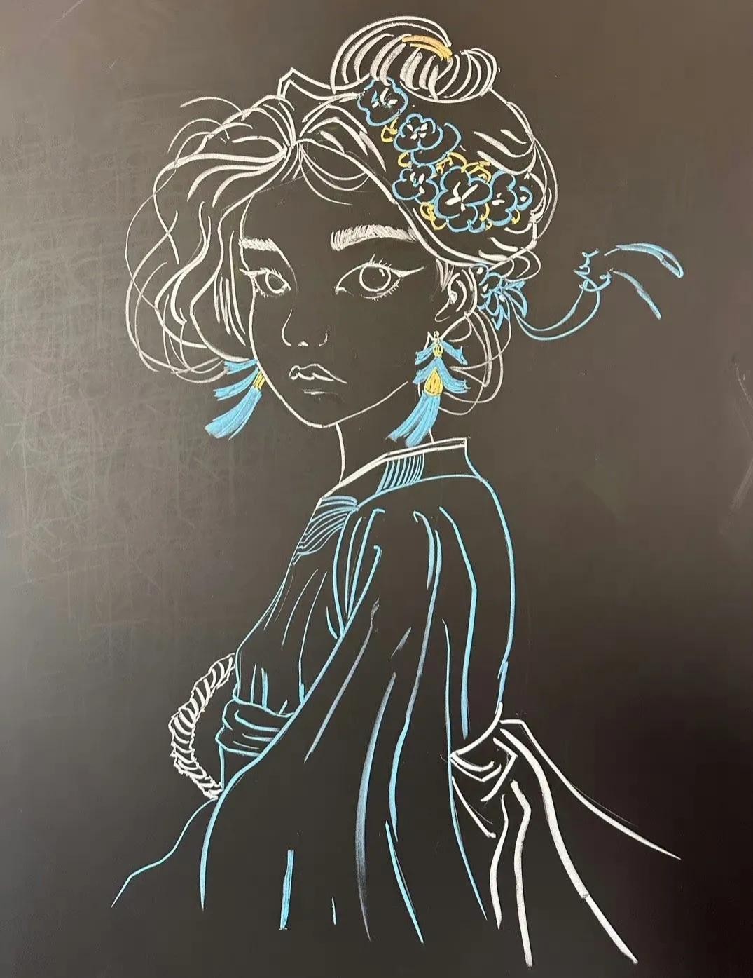 用粉笔在黑板上作画,在电子教具还没有普及的年代,它是一种十分经典的绘画方式,老师们会用它来讲学或演讲。