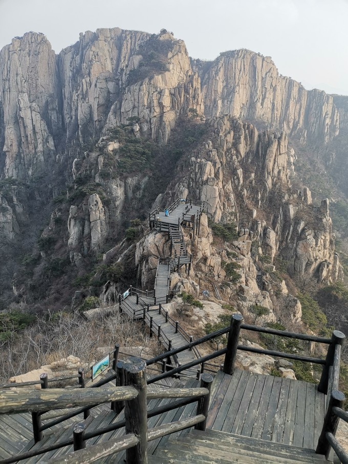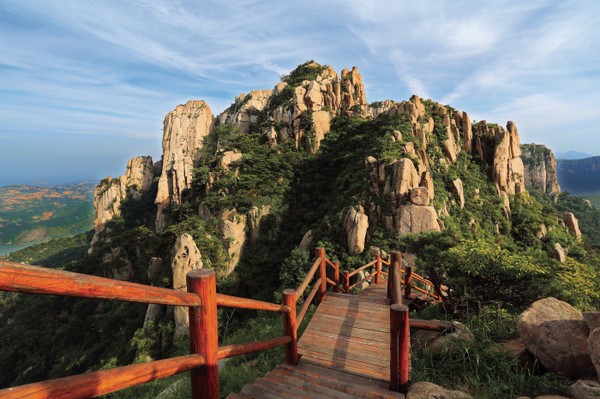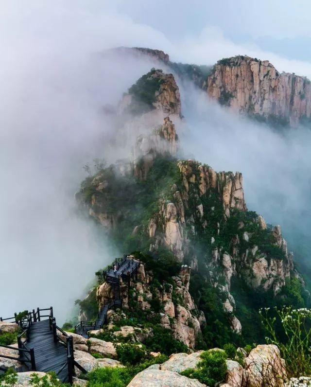 天崮山的千米木栈道,宛若一道天梯盘桓于主景区山际之间,气势恢宏,古朴壮观。