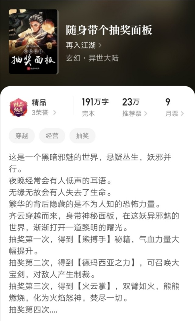 这也是一本以前推荐过的小说,不过有书友在搞笑小说中和我提到这本,我回来看看,发现现在更新很多了,将近二百万字,现在看也不错。作者有完本小说《随身带个抽奖面板》书荒可看。