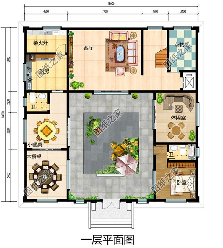 一层户型:客厅、大小餐厅、厨房、柴火灶、杂物间、老人房(带卫生间)、休闲室、卫生间;