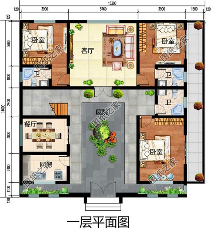一层户型:前院后院、庭院、会客区、堂屋、厨房、餐厅、卧室(带卫生间)、棋牌室、储藏间、卫生间;