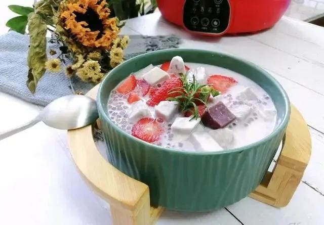 8.吃的时候往碗里加入适量西米和香芋紫薯,加入适量晾凉的椰汁,再加点水果就可以开吃了