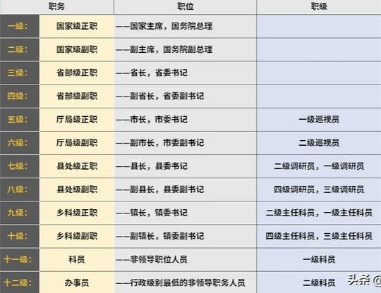 能称得上职务的,再小也算是领导,其实这下面还有2级是没有明文规定的,分别是科员级与办事员级,为了方便排序,我们暂且称为十一级和十二级。