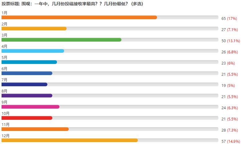 从投票看,大家普遍认为1月、12月的投稿成功率最高,其次是3月。最低是年中6-8月的时候。