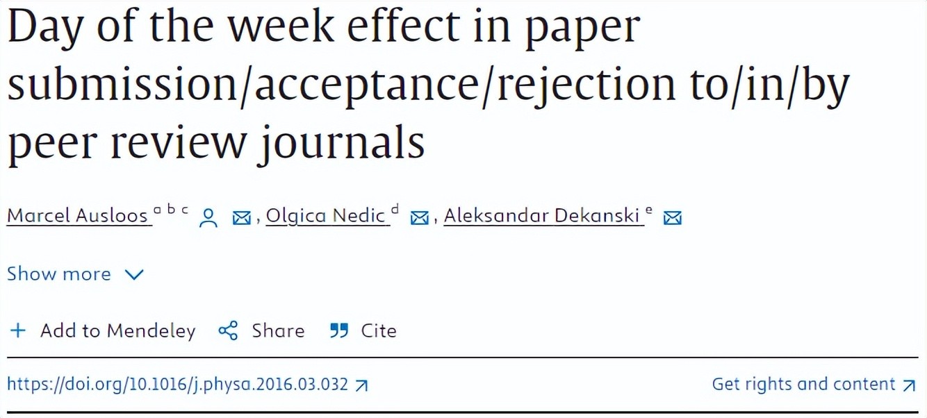 submission/acceptance/rejection to/in/by peer review journals》的论文,研究了作者向科学期刊投稿的行为。结果显示:周六、日的拒稿概率最高,而周二、三的接受概率最高,这就是「周二·周三效应」。