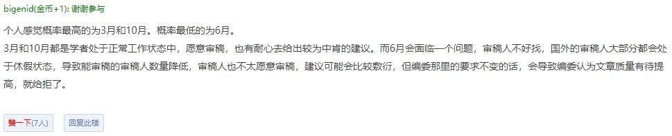 一位自称资深编辑的小伙伴说:3月和10月学者处于工作状态,愿意审稿,也更有耐心。而6月时,国外审稿人大部分处于休假中,导致审稿人数量降低,即使愿意,建议也往往比较敷衍,很可能以“文章质量有待提高”为由直接拒掉。所以,概率最高的为3月和10月,概率最低的为6月。