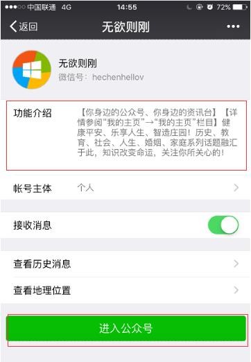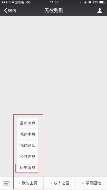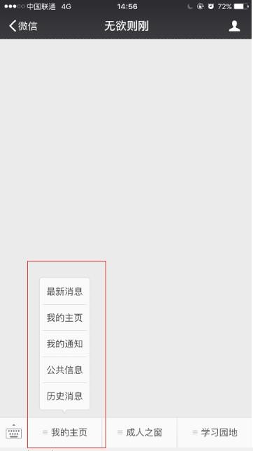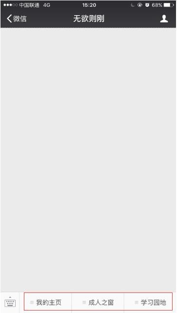4、微信公众号“无欲则刚”主界面是进行了“个性化菜单”设置,方便大家及时、分类查阅相关栏目,而有些公众号主界面底栏没有这个设计,完全就是一个空白;