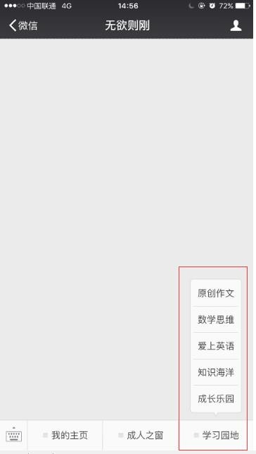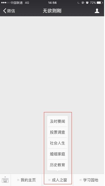 3、微信公众号“无欲则刚” 主界面设计有 “我的主页”、“成人之窗”、“学习园地”三个栏目;