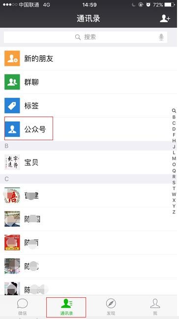1、点击手机微信的“通讯录”→“公众号”进入公众号列表;