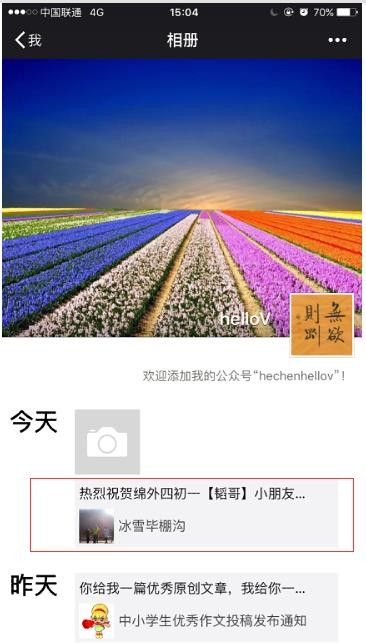 2、如果你是我的微信好友,直接进入我的相册,随便找一篇我曾经发表过而且转到我的朋友圈的文章,关注文章抬头的蓝色小字“无欲则刚”或文章末尾扫描识别我的二维码即可;