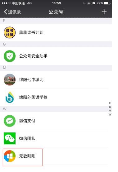 2、选择你喜爱的公众号“无欲则刚”,点击进入;