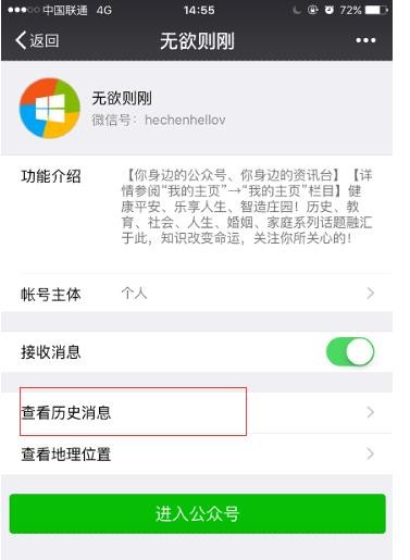 2、通过微信公众号功能介绍主界面,点击“查看历史消息”查看;