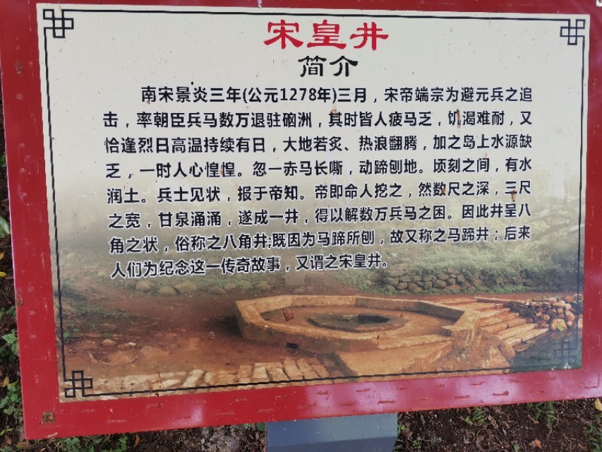 传说,宋景炎三年三月,(1275年),元兵挥师 南下,追杀南宋帝,南宋将臣陆秀夫、张世杰、文天祥等文武百官及十万士卒,护送年仅11岁的宋端宗和其弟卫王赵昺,从东南沿海逃亡到硇洲岛,来到此地,兵马找不到水饮,干渴难熬,一匹战马用蹄子扒开地面,涌出一股清泉,使宋皇兵马痛饮一气,后人建成了此井,井深不到2米,井水白冽清澈,喷涌而出,终年不枯不竭,泉水饮用自今,此井四周野草丛生,树叶繁茂.古树盘根错节,参天入云,南宋末朝曾在这里开设帝基,建造行官,营房,将士日夜操练,以待来日再起,光复江山。
