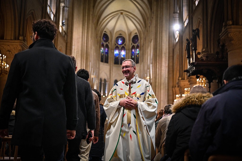 当地时间2024年12月8日,法国巴黎,巴黎圣母院院长奥利维耶·里巴多·杜马斯(Olivier Ribadeau Dumas)欢迎前来参加首次公众开放日活动的民众。