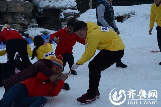 泉城公园里的冰雪世界有一个非常刺激的场地,名字叫做急速滑道。人要从大约20米高的坡道上乘坐轮胎滑下来,我想这可能需要巨大的勇气吧?!而我们的第三轮游戏就要从这个坡道上举行——要求两队成员首先在雪地上大象鼻子转十圈后爬上坡道,到达高台后乘坐轮胎滑下来,之后一队里有一人成功脱下鞋子并穿上摆在地上的一双袜子即为胜利。游戏规则让人欲罢不能,本来惊险刺激王子范儿十足的高空滑道在比拼穿袜子的规则下立马接地气起来。雪地转圈各种转晕啊,急速滑到各种顺流而下疯狂叫喊啊,穿脱袜子过程中各种窘迫不堪啊,搭配看上去冰冻不已的天气,那酸爽,才叫过瘾……