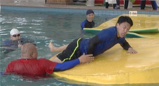 在抽红包游戏中,一向以幸运女神著称的崔璀,竟然意外地抽到了空无一枚金币的红包,命运悲催;抢占黄金岛游戏中,文章与敏健、周瑞与张喜亮分别上演了势均力敌的水中激烈对抗;水上瑜伽游戏将平地的双人搭档瑜伽动作搬到了水中浮毯上,难度系数瞬间飙升,即便是身材矫健、肌肉发达的敏健跟瘦弱的志波搭档,在平地上看似容易完成的一组动作,等搬到水上完成得也相当困难……水上投掷是两队对抗极为精彩的游戏,在长达9米的浮毯上奔跑的队员们仿佛“轻功水上漂”,但身体的不稳定性害得两队队员经常莫名其妙地坠入水中,彤彤曾多次遭遇眼看就奔跑到终点,即刻就可以投掷彩球却直接趴到了水中的囧况。