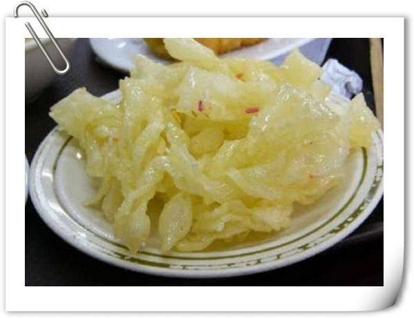 姜丝排叉:是把鲜姜去皮剁碎,把面粉加入少许明矾,两料用凉水和面,用温油炸制而成备用。或将面团擀至或轧至薄片,将面片上撒上细淀粉,叠成条状,用刀切成长约五厘米、宽约两厘米的叉条,两条重叠,顺切三刀,散开温油炸制。鲜姜去皮切丝,把姜丝用水熬开后,捞出姜丝,放入白糖,锅中加入饴糖、桂花,待熬开后用小火继续熬制,将炸好的排叉入姜汁,熬出桂花怡糖过蜜。此小吃为酥、甜、香口味,另有咸味排叉原料为面粉、姜丝、苏打和盐,惟一和甜味姜丝排叉不同的是不过蜜,味道为酥、脆、微咸,都具浓郁的姜香味。
