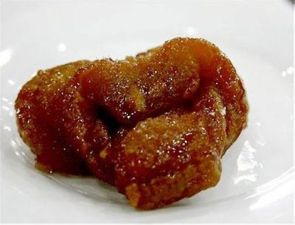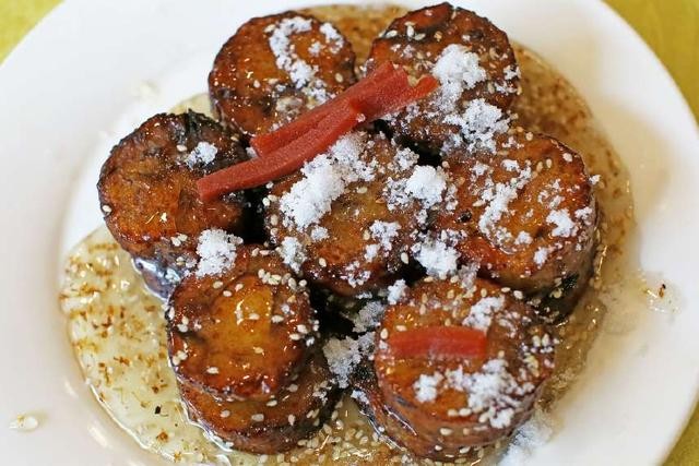 糖卷果:山药去皮剁馅,大枣去核,两料搅抖均匀,山药、大枣比例为3:1,用油皮包裹上笼蒸五分钟,蒸好后放在蒸馒头的布上,捏成菱形长条,晾凉后备用,油锅加油至七成热,炸至金黄色捞出。坐油锅,加水、油、糖炒糖色,小火熬制成糖稀状,倒入蒸好的糖果,撒上芝麻、白糖,绵甜、可口的糖卷果就做成了。
