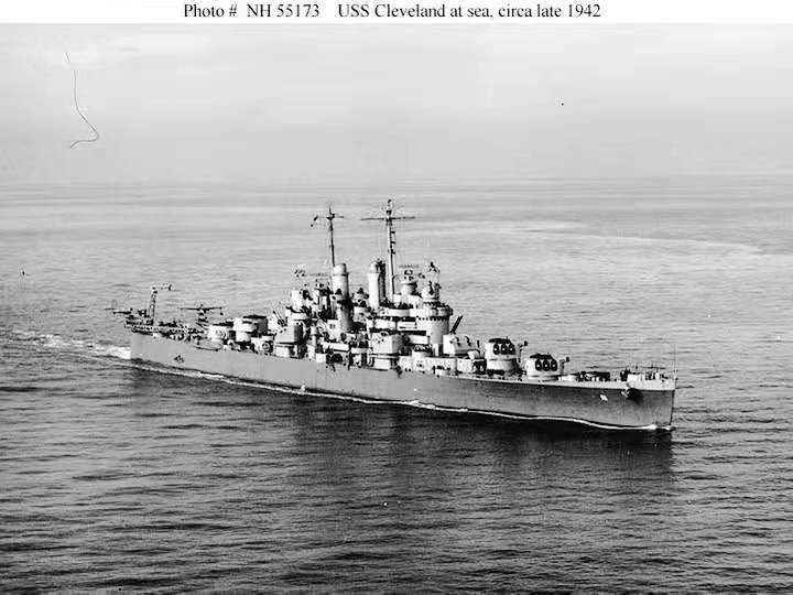 说完了克利夫兰级的故事,我们再来说克利夫兰级的大姐头克利夫兰号的故事。1942年6月克利夫兰号正式交付美国海军,当年12月5日克利夫兰号前往太平洋,并于1月16日到达所罗门群岛的埃法特岛。第一次执行任务是1月27到1月31日期间在第18特混舰队编成内护送一支部队到瓜岛,在1月29日到30日,克利夫兰号在伦内尔岛之战中于猛烈的空袭下向敌人开了火。