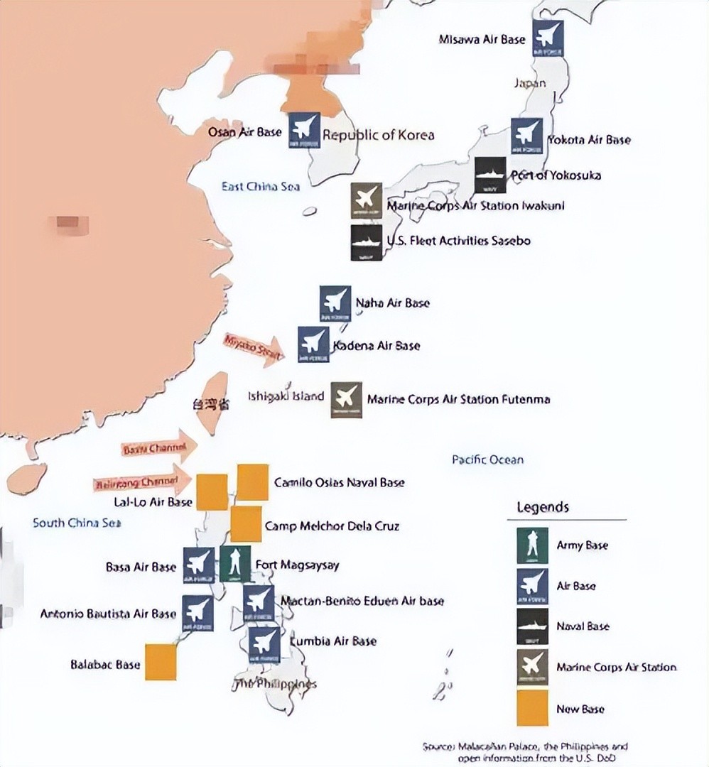 在第一岛链,美军依托日本、韩国、菲律宾等盟友的军事基地,部署了大量的军事力量,包括F-35战斗机、预警机、加油机等。