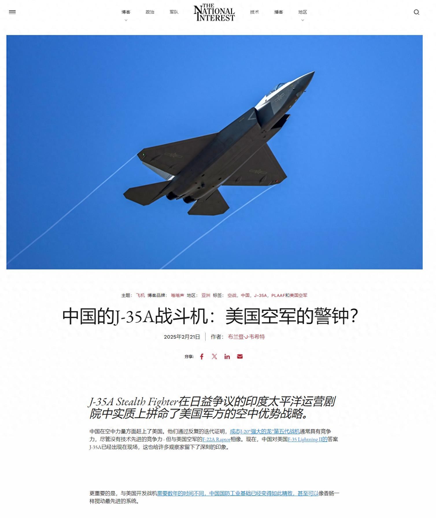 2月21日,美媒《国家利益》发表了一篇题为《中国的J-35A战斗机:美国空军的警钟?》的文章,观点十分大胆。