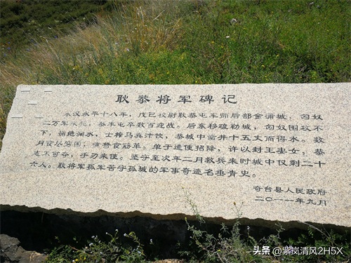 因为游客稀少,耿恭将军雕像周边的山坡上长满了荒草。我拨开荒草,在周边仔细查看,看到一块静卧在草丛中的长条石碑,这是奇台县人民政府于2011年9月在此处立的碑,上面镌刻的是《耿恭将军碑记》:“东汉永平十八年,戊己校尉耿恭屯车师后部金蒲城,匈奴两万军来犯,恭率屯卒数百迎战。后东移疏勒城,匈奴围攻不下,拥绝涧水,士筰马粪汁饮,恭城中凿井十五丈而得水。数月食尽穷困,煮驽食筋革。单于遣使招降,许以封王妻女,恭志不可夺,手刃来使。坚守至次年二月救兵来时城中仅剩二十六人。耿将军孤军苦守孤城的军事奇迹名垂青史。”