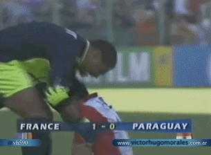 1/8决赛,巴拉圭碰上东道主法国。这是一场强弱分明的对话,然而巴拉圭摆出的大巴却卓有成效,缺少齐达内的法国队狂攻不下,迟迟无法取得进球,90分钟0-0,加时赛上半场0-0,场面有些丑陋。谁料第114分钟,布兰克打进金球,巴拉圭突然死亡!