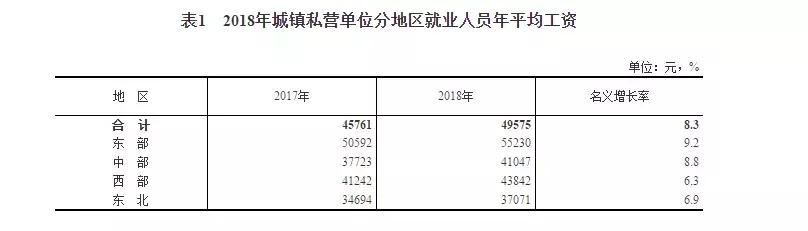 城镇私营单位就业人员年平均工资由高到低依次是东部、西部、中部和东北地区,分别为55230元、43842元、41047元和37071元,同比名义增长率分别为9.2%、6.3%、8.8%和6.9%。
