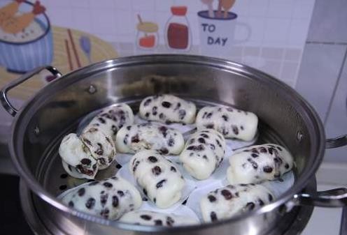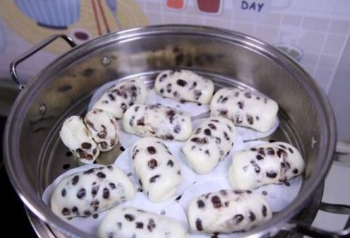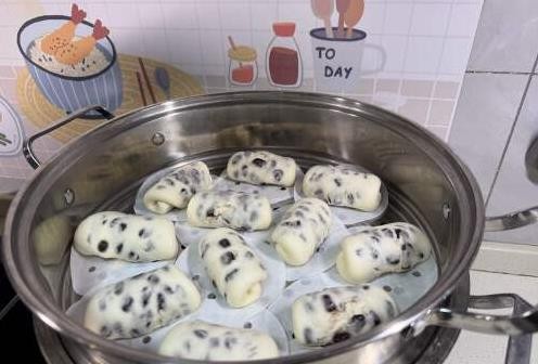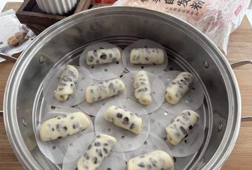 当面团发酵好后,将蒸锅里的水烧开,放入蒸笼。记住要用冷水上锅,蒸8分钟左右即可。如果你觉得馒头的表面有点湿润,可以轻轻打开锅盖查看,蜜豆卷的表面应该是光滑而蓬松的。