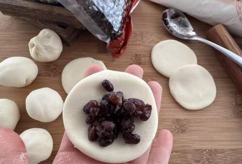 在面皮上放入一勺蜜红豆,像包包子一样将面皮包起来。记住,不用担心包子的褶皱,捏紧口就好,形状并不需要太完美。