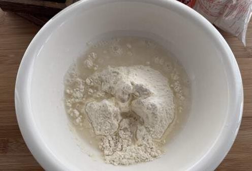 我选择了200克自发粉和110克温水,特别提醒大家,水要选择温水,温度稍微高一点,但不要烫手。特别是冬天,没有暖气的环境下,用温水可以帮助加速面团的发酵。如果水温过高,面团可能会发酵不完全。面粉的吸水量因品牌不同,大家根据实际情况适当调整水量。