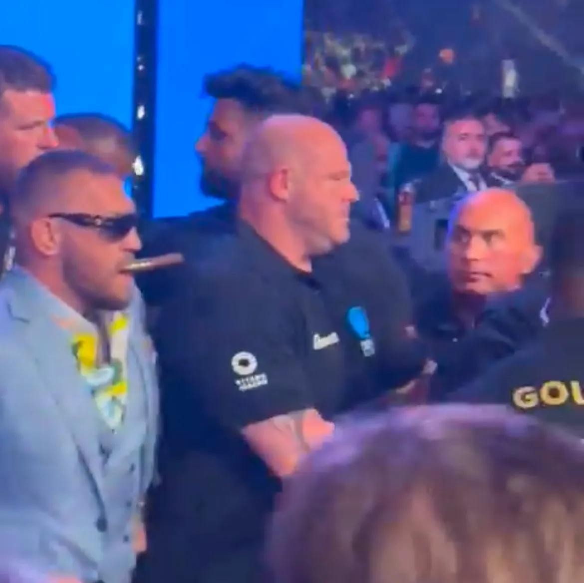 麦格雷戈的行程从机场开始就吸引了大量媒体和粉丝的关注。当他走出机场时,现场早已被热情的粉丝围得水泄不通。尽管安保人员尽力维持秩序,但粉丝们的热情依然难以阻挡。麦格雷戈身穿一套剪裁得体的深色西装,手中夹着一根点燃的雪茄,显得格外从容。他一边向粉丝挥手致意,一边不时抽上一口雪茄,仿佛在享受这场“粉丝风暴”。