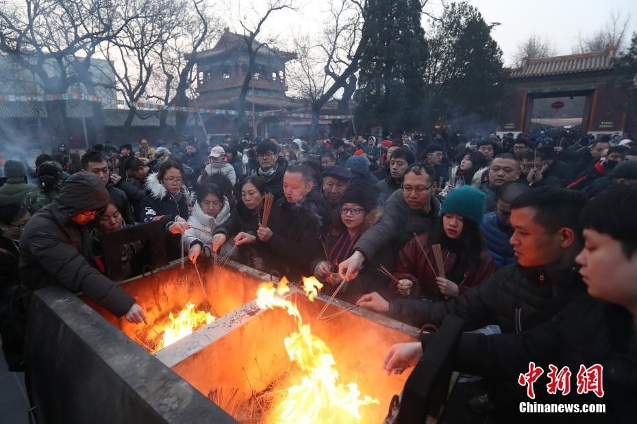 1月29日农历大年初一,很多人都选择到雍和宫敬香祈福来开启新年的第一天。早上7点整,第一批香客约4万人。最早的香客不畏严寒,从除夕夜里9点就来排队,排队时长近10小时,堪称“中国第一排队现场”。雍和宫开门后,由1米85武警战士头排压步,香客们有序进入雍和宫。