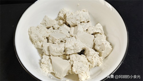 第二步:准备老豆腐一块,直接用手掰碎放入碗中备用。你也可以根据自己的喜好选择切片或者切块。