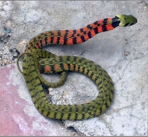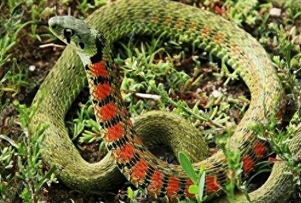 和其他蛇不一样的是,它的脖子上有一段十分明显的红色斑块,看起来就像是公鸡的鸡冠,原来这条蛇名叫虎斑游蛇,是一种特别危险的蛇类。