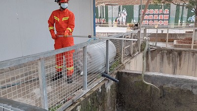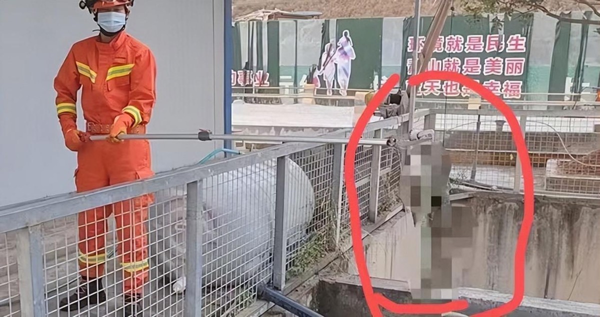 消防员在接到电话后,没多久就带着工具来到了工地里,在工人的带领下,来到了有蛇出没的蓄水池旁。
