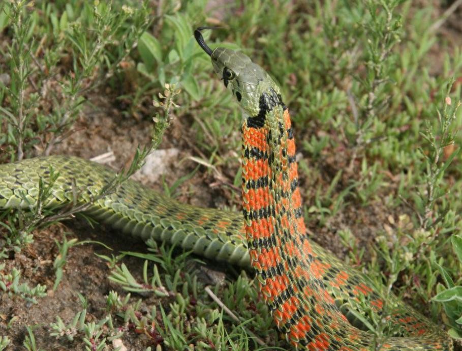 但如果你遇到的是成年的虎斑游蛇,那就要小心了,你首先要做到就是跑,它们和眼镜蛇一样,在捕杀猎物时,会竖起身子,做好时刻攻击的准备,所以我们唯一能做的就是远离它。