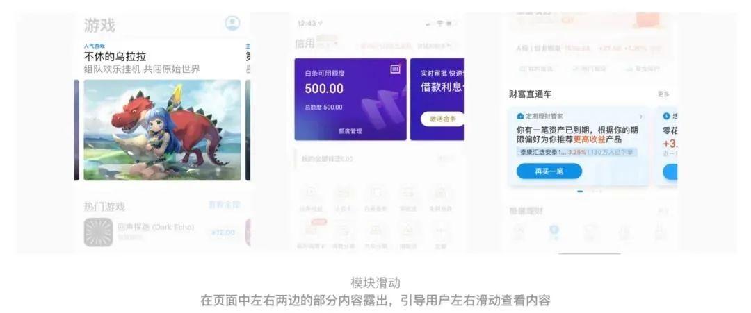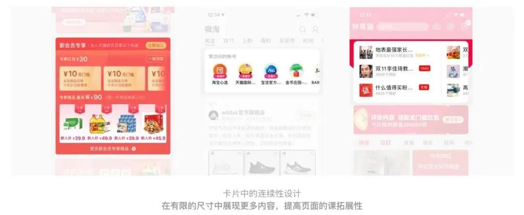 连续性目前在 app 产品中应用非常广泛。比如在电商产品中 banner 区域的左右滑动交互模块,滑动组件和进度条展示。主要应用范围包括:导航栏中的连续性设计、卡片模块中的连续性设计、模块的连续性设计、滑动条的连续性设计。