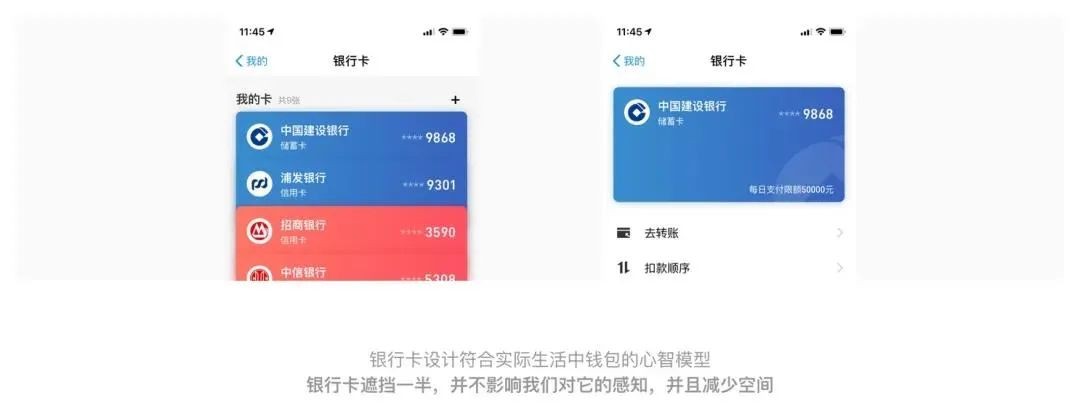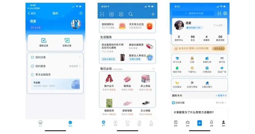 如下图所列举的支付宝和知乎界面中,运用卡片设计框架,将信息聚合靠近展示来体现关联性,层次清晰有序。